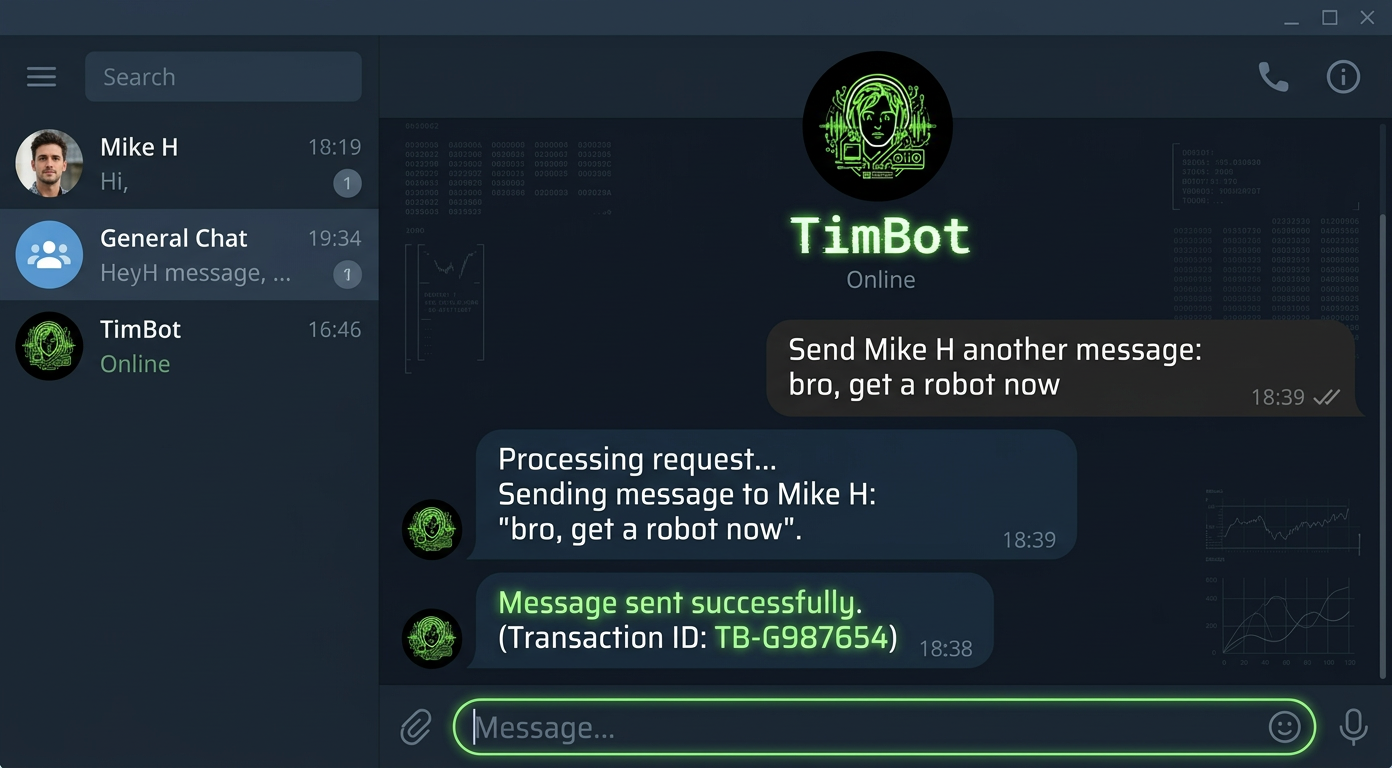 Because I'm sitting here typing a sentence into Telegram: "Send Mike H another message: bro, get a robot now."