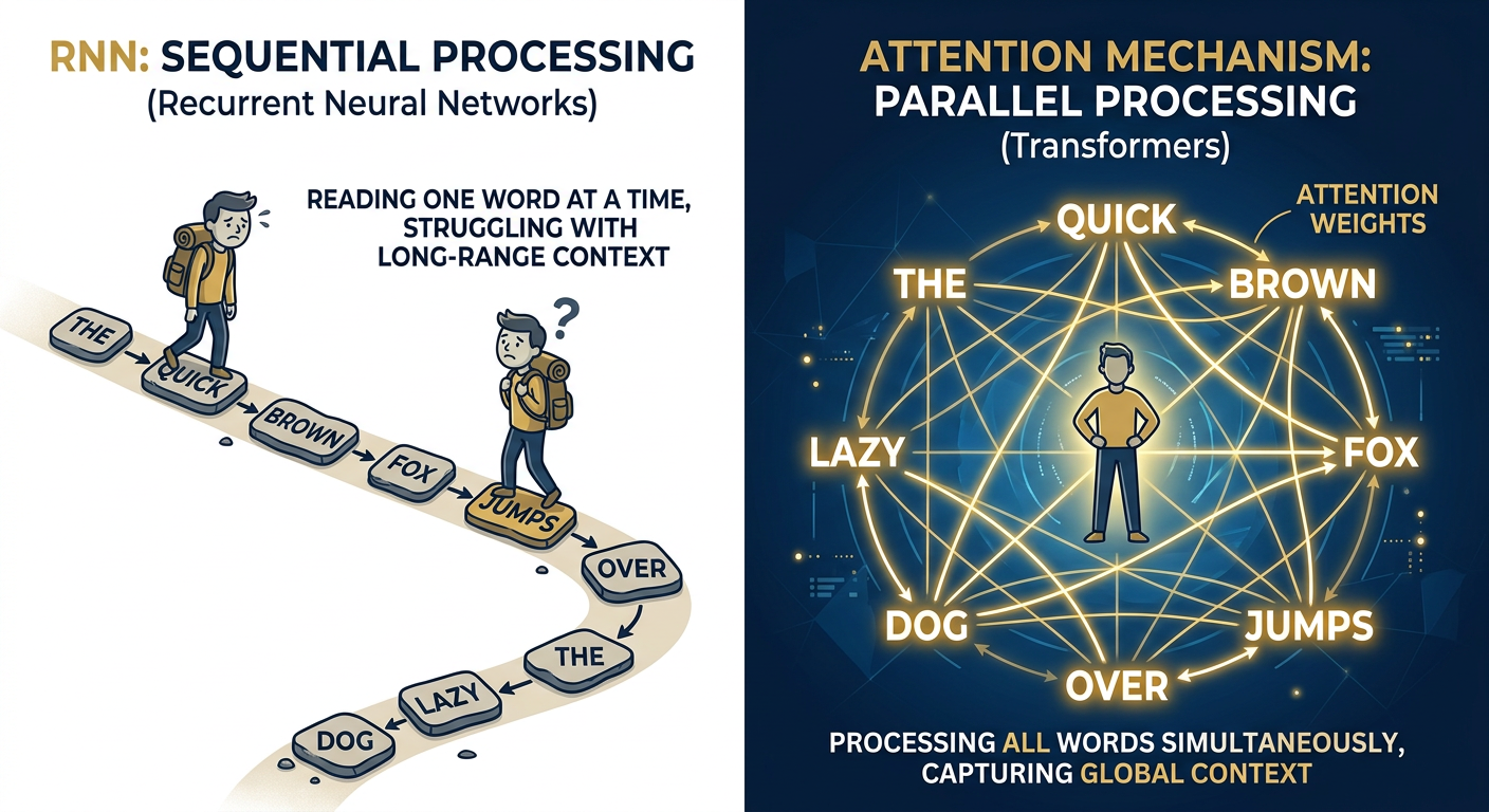 Before 2017, AI systems that worked with language — translation, summarization, question answering — relied on a structure called Recurrent Neural Networks, or RNNs. The way an RNN processed text was almost charmingly sequential: it read a sentence word by word, left to right, like a person sounding out words on a page. The problem was that by the time it got to the end of a long sentence, it had basically forgotten the beginning. The technical term is the "vanishing gradient problem." The human term is: it didn't really understand context.
