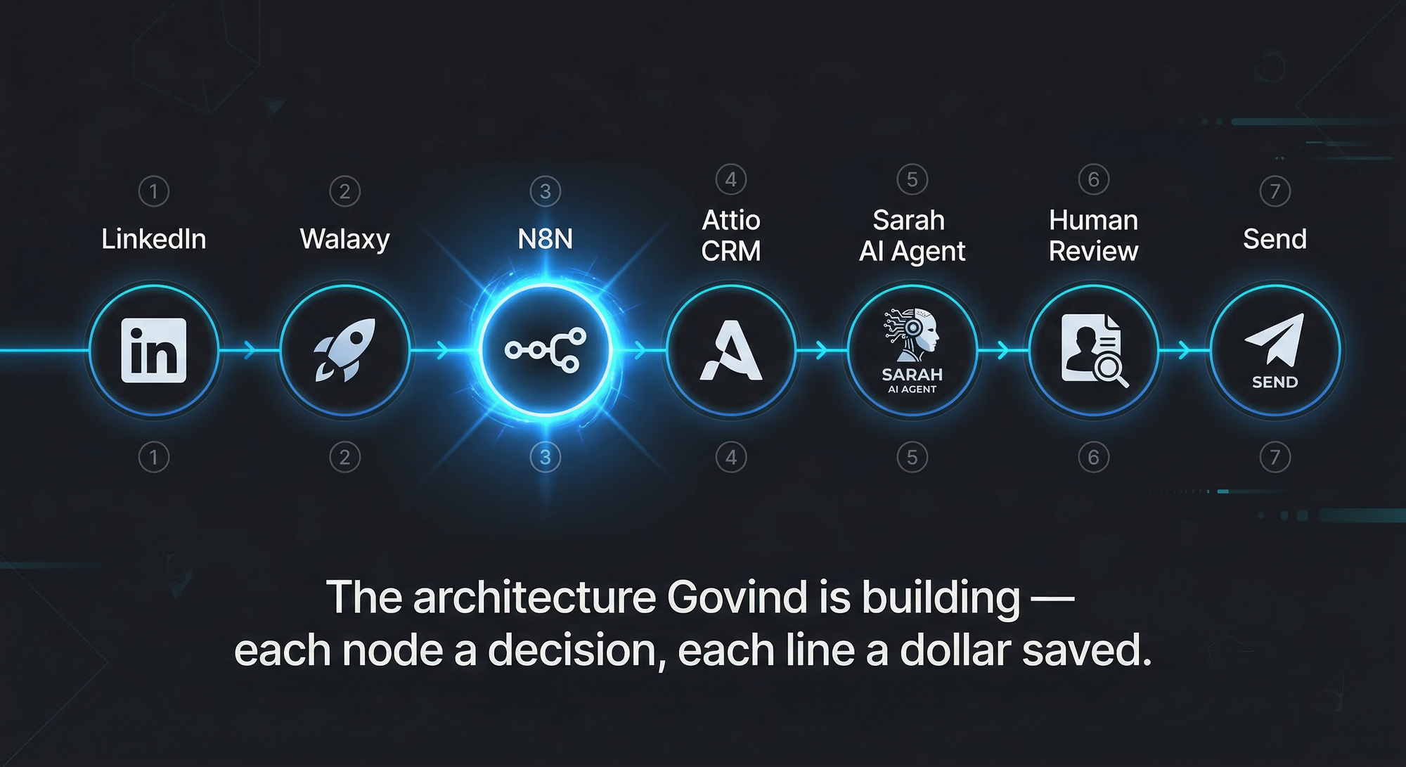 Pull back and the real story snaps into focus. Govind isn't just trying to save $30 a month on SyncIn. He's building an AI-powered BDR (Business Development Representative) — a system where the machine does the heavy cognitive lifting of drafting personalized follow-ups, and the human stays in the loop for final approval before anything hits send. It's an important distinction. This isn't about replacing human judgment; it's about removing the grunt work that exhausts it.